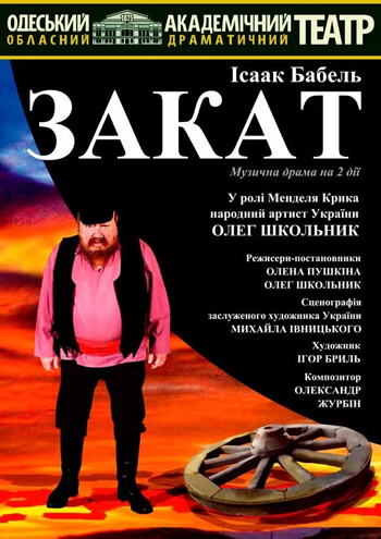 «- Сто раз на дню старик убивает нас, а вы молчите ему, как столб!» «- Он коней, дом, жизнь — все девке под ноги бросил!» «- Всю Одессу в руках держал… Вот какой старик был!» «- Но бог имеет городовых на каждой улице, и Мендель Крик имел сынов в своем доме. Городовые приходят и делают порядок.» Самое знаменитое драматургическое произведение Исаака Бабеля – пьеса «Закат» 30 лет спустя вновь на одесской сцене в новой масштабной постановке. Действие происходит в 1913 году в Одессе, зрителей ждёт встреча с легендарным миром старой Молдаванки и его обитателями – биндюжниками, торговцами, музыкантами, налётчиками из банды Бени Крика и прочим пёстрым одесским людом. В роли Менделя Крика – народный артист Украины Олег Школьник.